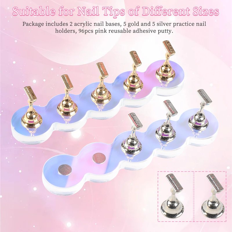 - 💜【ANGNYA Press on Nail Stand】You will get 2 acrylic aurora nail bases ,5 golden practice nail holders and 5 silvery practice nail holders and 96pcs pink reusable adhesive putty. nail holder for painting nails is great for display your nail art, practicing painting your nails, or holders for press on nails, Nail tech must haves, great add-ons for your press on nail kit.
