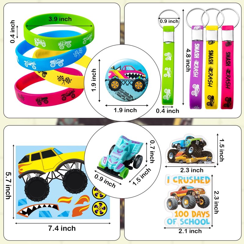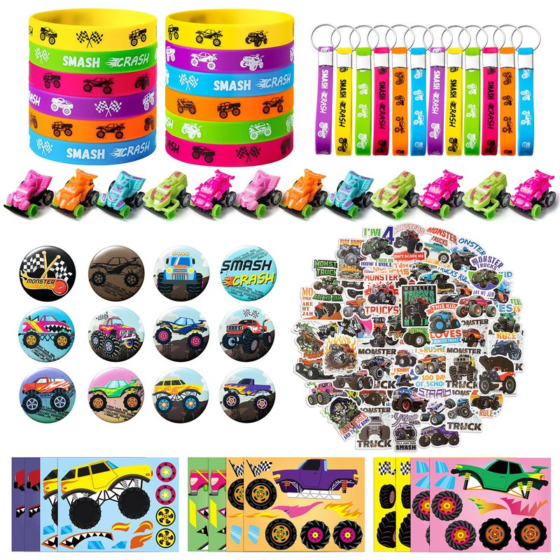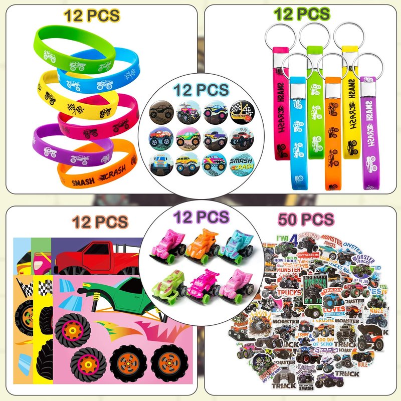 - What You Get: Monster truck cars*12,monster truck stickers*50,monster truck keychain*12,Monster truck bracelet 6 types *2,monster truck badge*12,monster truck face stickers*12