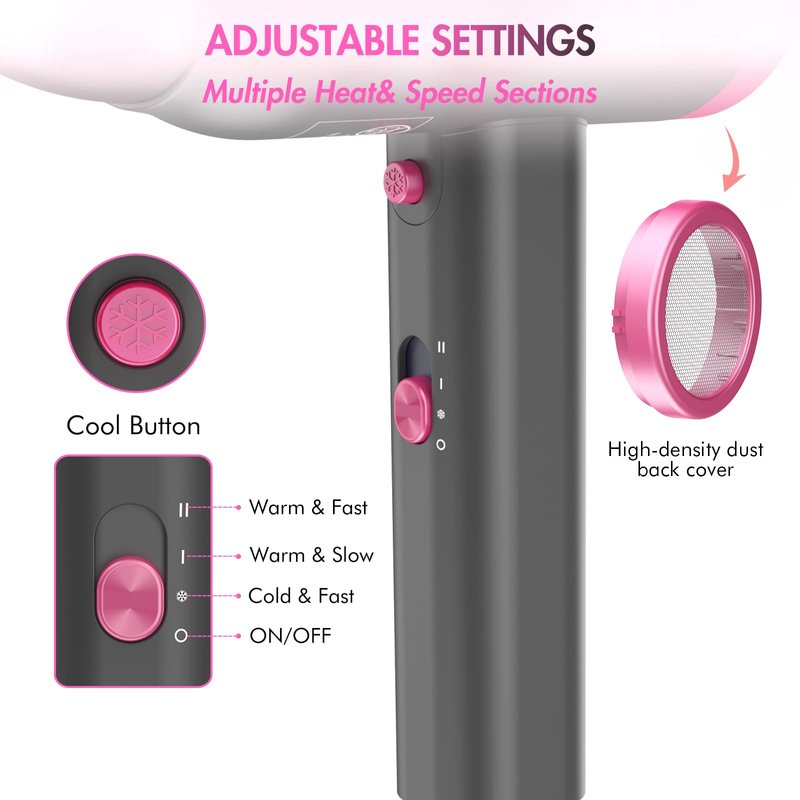 - 【Lightweight & Compact Design】The portable hair dryer boasts a small compact and a weight of 0.8lb that prevent from arm cramps and achieve effortless using. The unique handle of travel hair dryer ensure comfortable usage due to the ergonomic design. Furthermore, high-density dust back cover protect your hair from being pulled in.