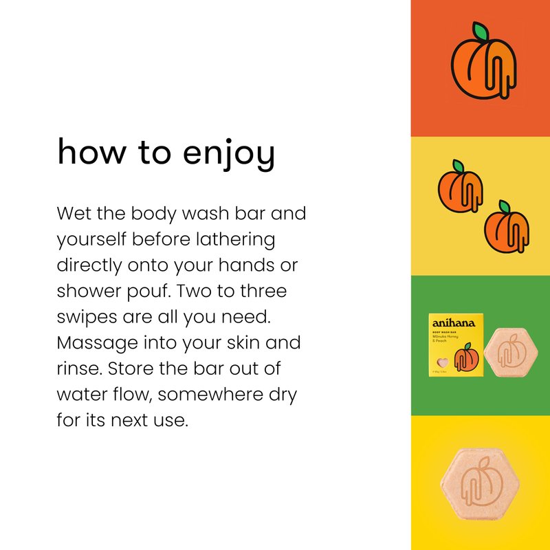 How To Use Wet body wash bar and yourself before lathering directly onto your hands or shower pouf. Two to three swipes is all you need. Massage into your skin and rinse. Store bar out of water flow, somewhere dry for its next use.