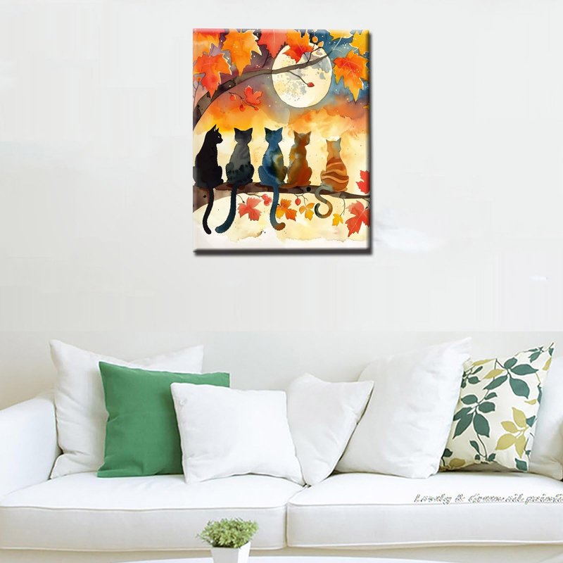 Animal at Full Moon Paint by Number Five Cat Sat on Tree Brach DIY Painting on Canvas with Brushes Acrylic Paints Wildlife Paint by Numbers for Adults and Kids Beginner 16x20 Inch(without Frame)
