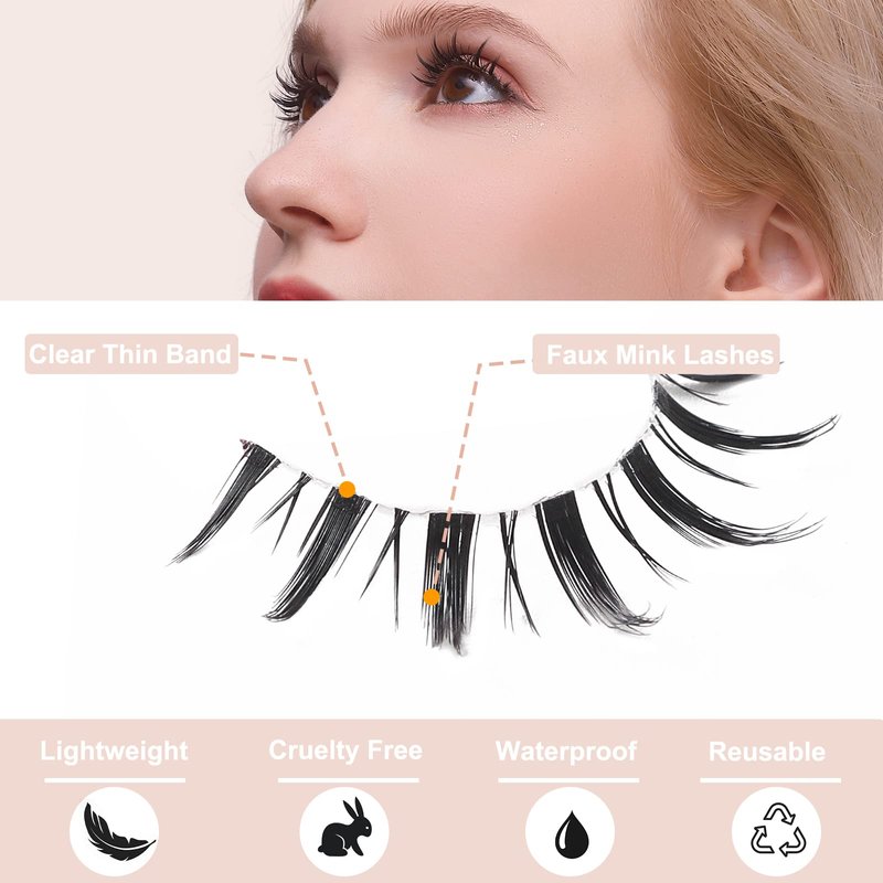 - 2. High Quality: Made of high quality imported fibers, wispy and light lash, the eyelashes are almost weightless as a whole, invisible slim clear band, they will stay firmly on your eyes all day, Great wearing experience!