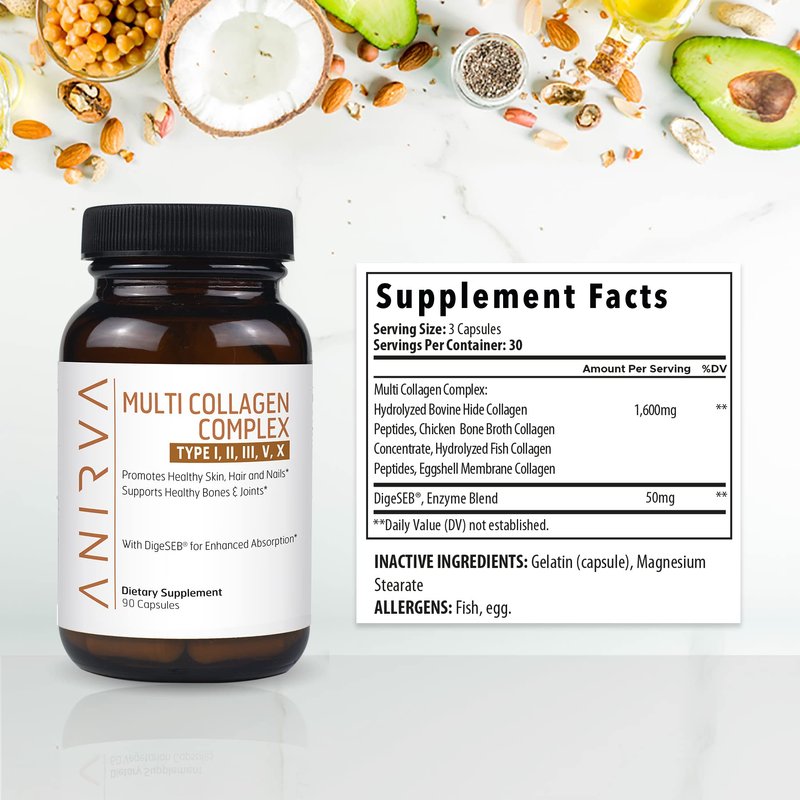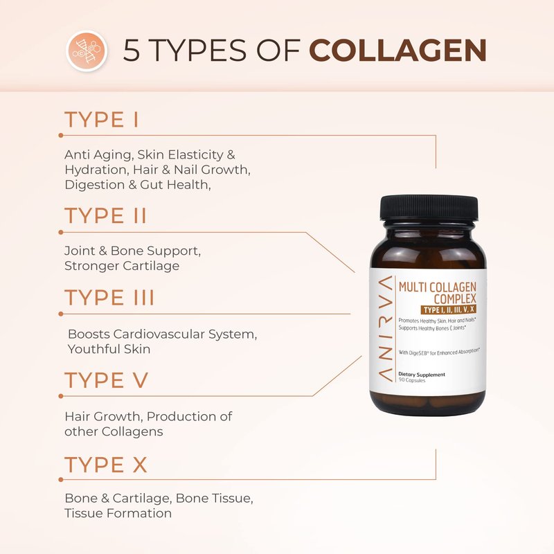 - ✅ FORMULATED TO BATTLE AGAINST AGING: Anirva’s Multi Collagen Complex supplement made up of collagen sources I, II, III, V and X. One of the best collagen supplements for both women and men to Support hair, skin, nails, joints & gut health. This collagen supplement is an easy to take capsule & Each Collagen pill contains DigeSEB for easy absorption.