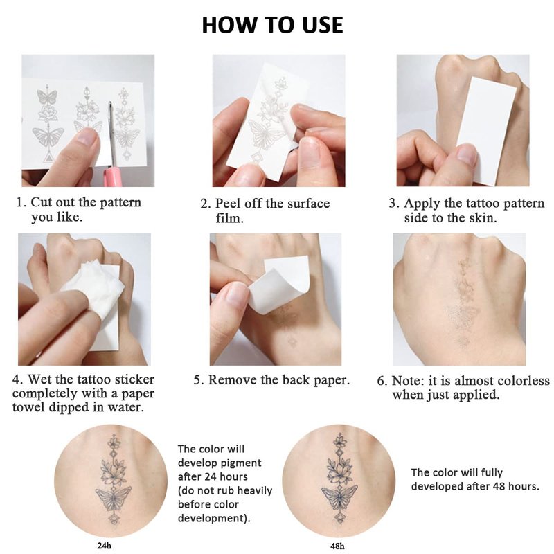 - Long Lasting: Our semi permanent tattoos can last 1-2 weeks after applied. You can take no worry to swim, do sports or take shower. Note: the tattoo is almost colorless when just applied, and the color will turn into dark blue color in 24-48 hours. And time goes on, the tattoo color will turn lighter gradually until totally disappear.