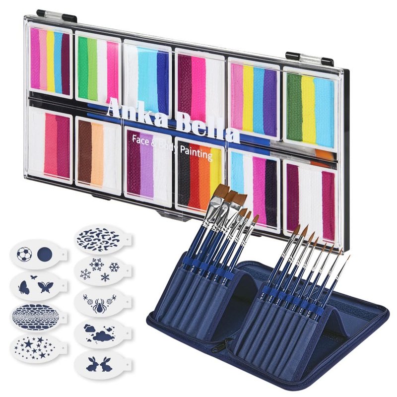 Anka Bella Kids and Adults Can Use Face and Body Painting set -12 color Paint Palette, 14 Brushes and Matching Pen Bag, Professional Easy to Clean Paint For Halloween. (Rainbow Valley set)