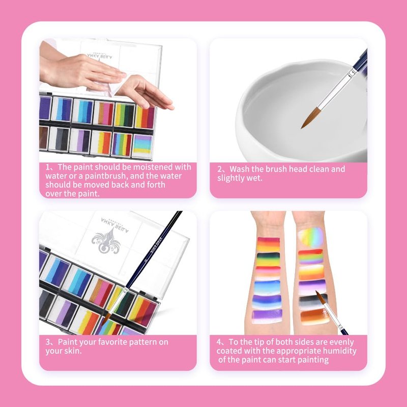 Easy to use and easy to store: This face paint is made up of 12 squares, each of which can be taken out individually, making it lighter and easier to use. 14 brushes with a brush bag for easy storage.