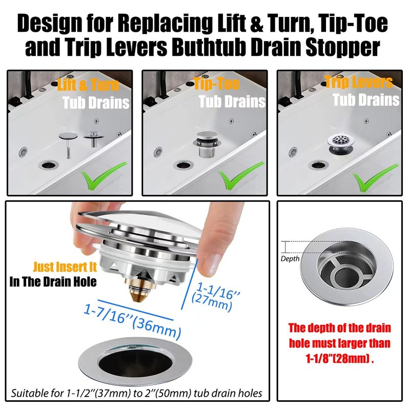 - [Perfect Compatibility] Universal bathroom bathtub stopper fits 99% of standard US tub drain, with your choice of 3 silicone gaskets to fit your existing 1-1/2 in to 2 in (37mm-50mm) bath drain hole.The depth of the drain-hole must be no less than 1-1/8 inch (28 mm). [Be sure to measure your drain size before purchasing]