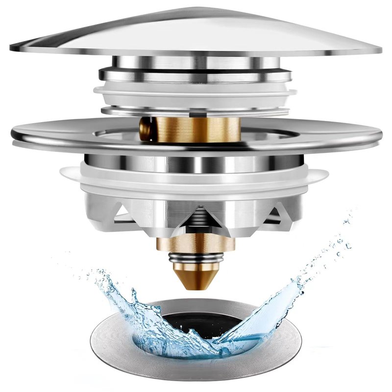 Upgraded plug, 2 in 1 stopper and filter design, one-piece detachable design, no need to install, insert and use. Pop-up button, press to store water and open to discharge water.