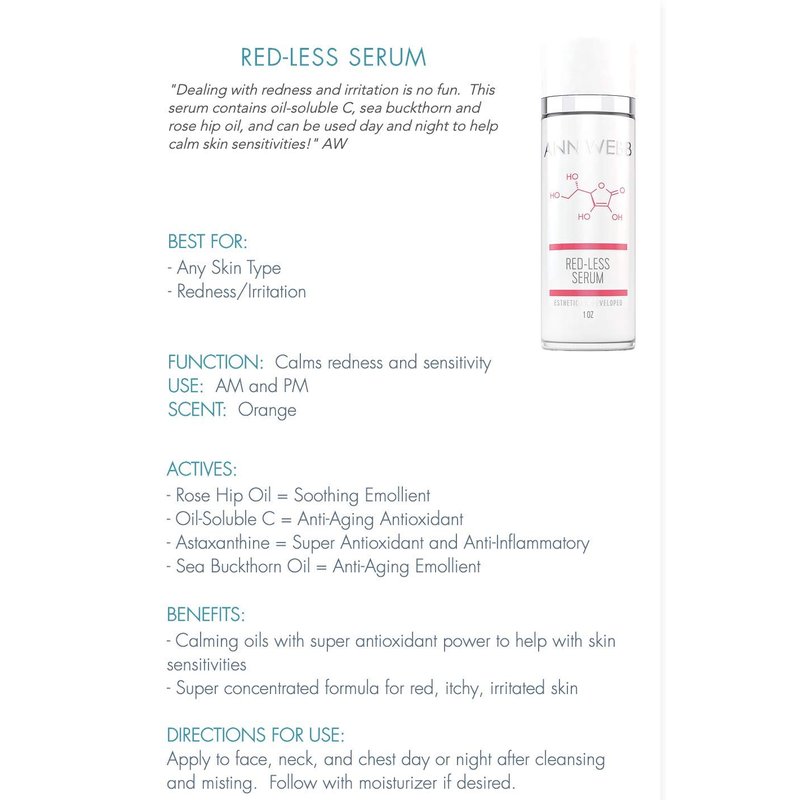 Discover a new level of natural radiance with ANN WEBB's Redless Relief Serum! Our proven blend of Vitamin C, Vitamin E, and powerful antioxidants works to soothe, hydrate, brighten and boost collagen, leaving your skin glowing with renewed youth. Say goodbye to dry irritated skin and hello to a soft, more vibrant complexion with this revolutionary serum. ANN WEBB Skin Products Redless Relief Serum: Anti-aging serum fights rosacea, hydrates & boosts collagen. ALL NATURAL Vitamin C Serum, Vitamin E, Sea Buckthorn, Rosehip Oil, Astaxanthin & Hyaluronic Acid HYDRATING: Helps moisturize, plump & boost collagen CALMING: Calms skin. Vegan, Cruelty Free and Made in Dallas, Texas