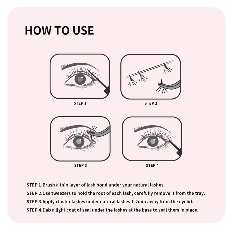 - ❤How to use the lash extension kit:The lashes extension kit is very easy to use at home. Curl your lashes with an eyelash curler. Apply volume cluster lash extension glue to the roots of your volume cluster lashes or lightly brush your natural lashes with a lash bond. Easy to do even if you're a beginner, make DIY cluster eyelash extensions more real like own lashes.