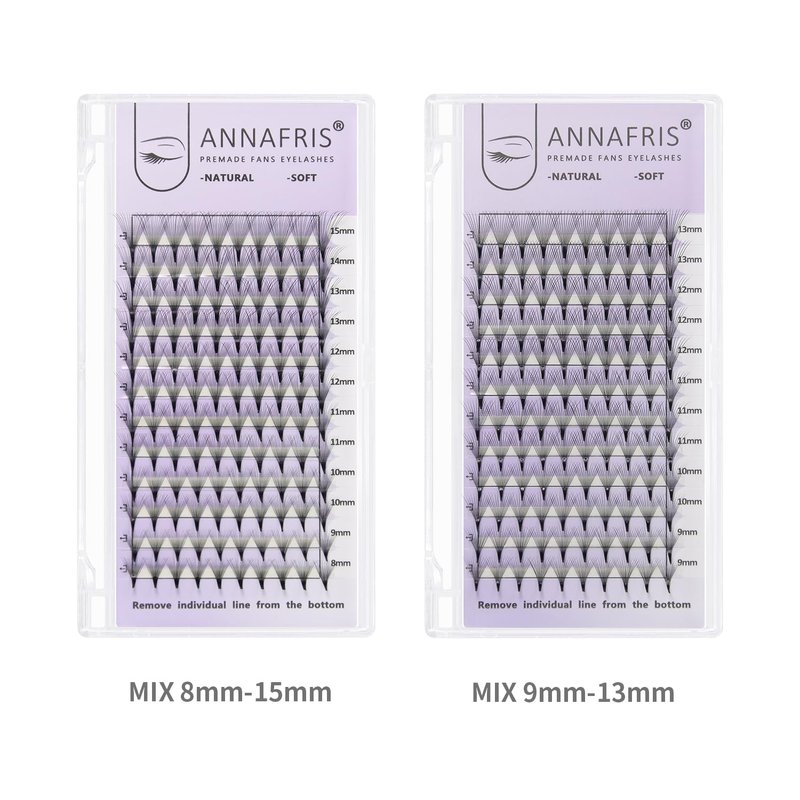 Specifications :ANNAFRIS New Pointed Base premade fans lash extensions 10D 12D 14D 16D 20D 0.05/0.07 C/D curl 8-15mm/9-13mm mixed,10 pcs per row,12 rows,total 120 pcs premade fans lashes.Pointy Base & Heat Bonded:These premade fans eyelash extensions have a pointy base that easy to graft, the right application leads to the best retention. And we use Heat Bonded instead of glue to treat the root ensures rootless skinny bases, so they connect with natural lash very well, volume and fluffy, without damaging natural lashes.High Quality :The use of high-quality imported lightweight materials, soft texture and light and small will not cause damage to the eyelashes, it seems to be your real eyelashes, you can't feel its existence.The matte black texture is closer to real eyelashes, creating a high-end atmosphere, making you glamorous and charming at all times.Easy To Use :Superb easy to work with, the strip peels off from the lash tray and pre made fans are easy to take off from the strip, you can grip the premade russian volume lashes without falling apart. According to your needs, grafting pre made lashes each time can help you save huge time.After-sales Service:We are a professional eyelash products manufacturer, we can do your private label and your own logo.If you have any questions about our premade fans eyelash extensions or want to know about wholesale matters,please contact us directly,and we will do our best for you.