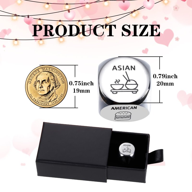 - ❥Couples Gifts Ideas: Funny food decision dice to solve your daily problems about What to Eat Today? Made of premium stainless steel, the food dice would not bend or break easily. And it comes with gift box, perfect for giving. Cute gifts for couples, couples christmas gifts, couples gifts for him and her, date night ideas. Funny birthday gifts for women men, romantic gifts for her birthday, birthday gifts for women friendship, valentines day gifts for boyfriend, boyfriend birthday gift ideas.