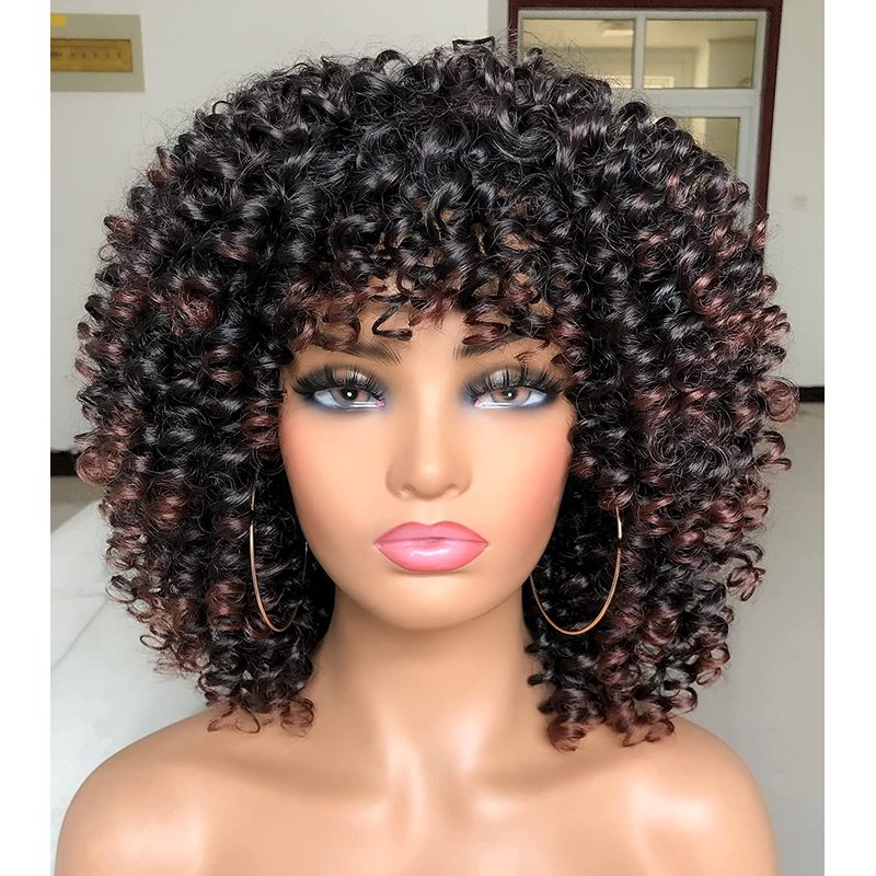 ANNIVIA Curly Afro Wig with Bangs Short Kinky Curly Wigs for Black Women Synthetic Fiber Soft Hair Short Curly Afro Wig (Black Ombre Brown)