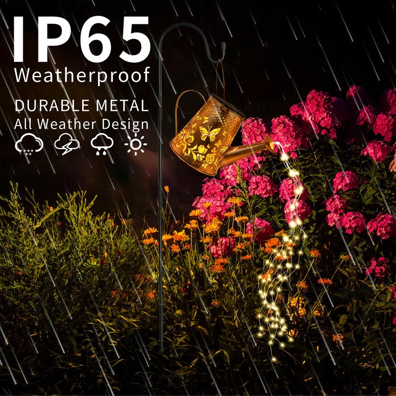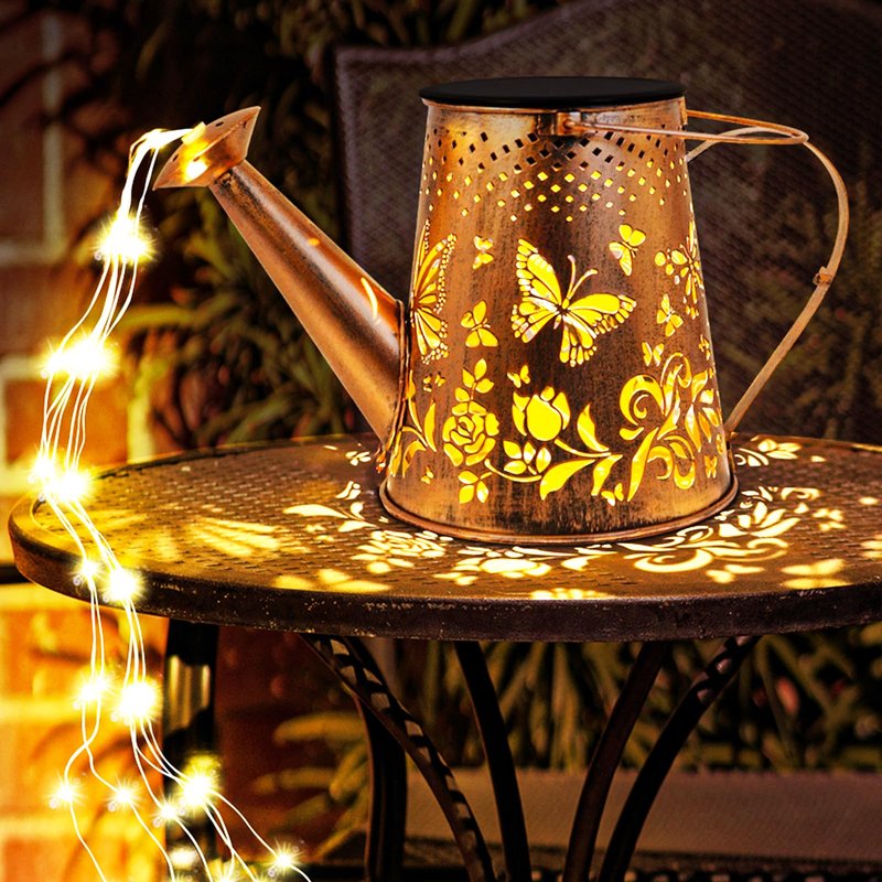 - 【EASY TO SET UP】-The light is with 39 inches shepherd hook, which makes it very convenient to hang it in your garden anywhere you like. And this watering can's body have beautiful hollow flower patterns, you can use it as outdoor table lanterns,when night falls,the watering can lit up and create beautiful unique flower light patterns on your tables.
