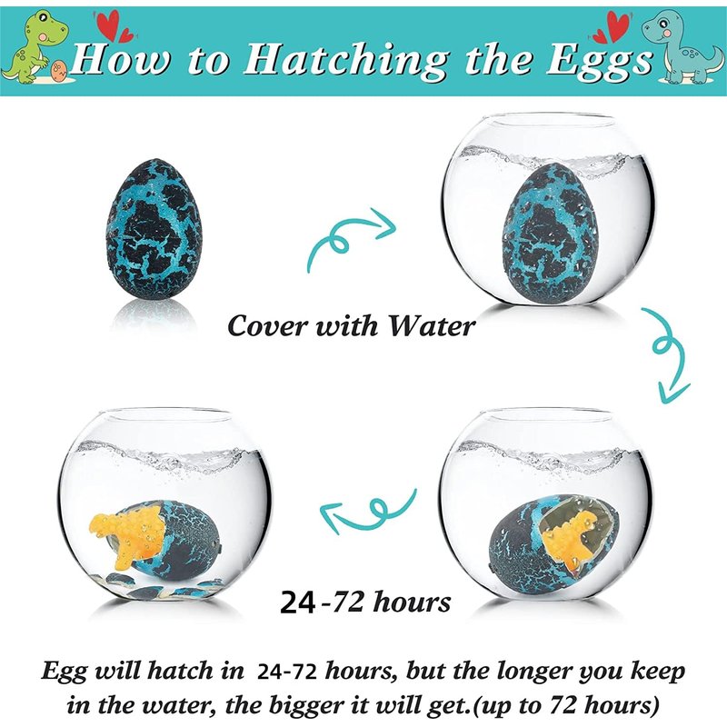 - NOVELTY HATCHING DINOSAUR EGGS - Hatching dinosaur eggs that grow in water! The dinosaur grows in water and shrinks again after leaving the water. Just place them in a small cup of water (>100℉), a mini dinosaur would break up the shell in 24-72 hours. The longer it's left in water, the larger it will grow!