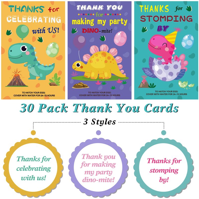 - COMBINATION OF DINOSAUR EGGS & DINO THANK YOU CARDS - This Party favor set includs 30 dinosaur eggs in black crack colors(approximately 0.79”/2cm - 1.18"/3cm inches), 30 dinosaur thank you cards (3"/7.5cm x 4.53"/11.5cm), and 30 cello bags.
