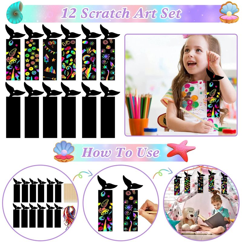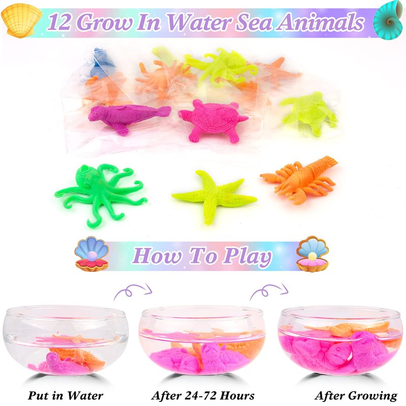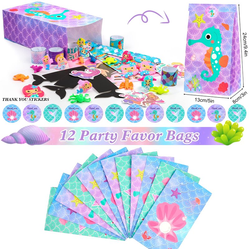 - BEST VALUE MERMAID PARTY SUPPLIES DECORATIONS - Contains the most popular mermaid elements on the market: the grow in water animals, the mermaid themed make a face stickers and mermaid scratch art kit and more. The favors can be put into 12 mermaid goodie bags separately, all these will be a big hit for kids!