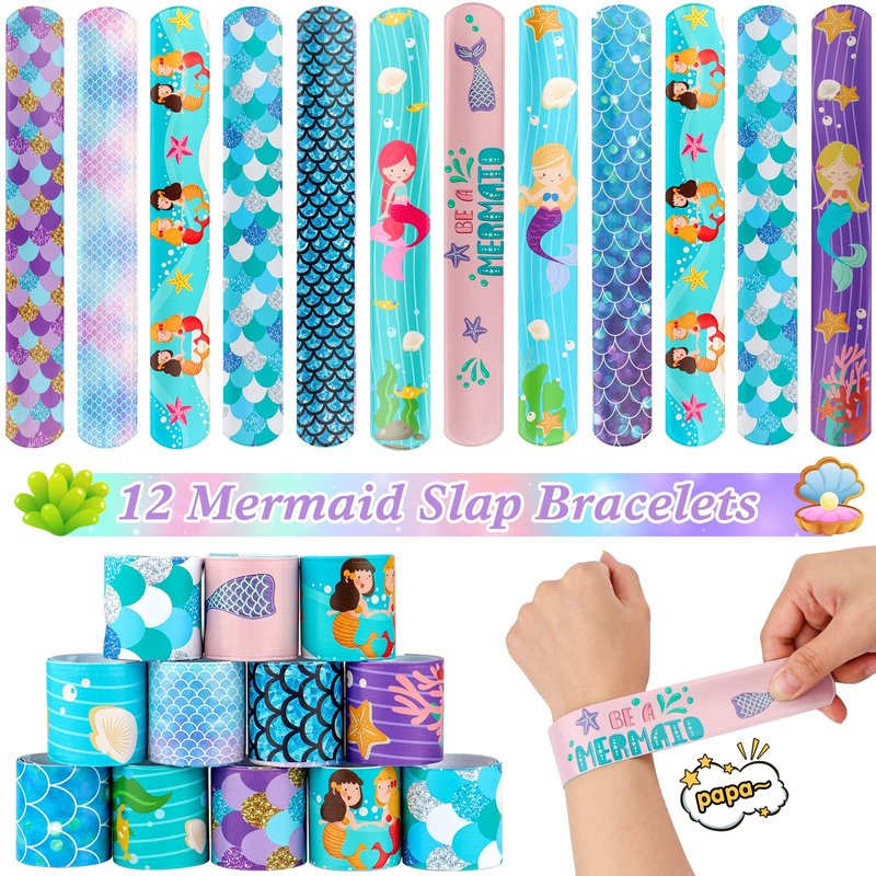 We have planned out the perfect novely mermaid party favor packs of 134 PCS, including 12 mermaid keychains, 12 mermaid riings, 50 stickers, 12 slap toys, 12 mermaid scratch art set, 12 make a face stickers, 12 grow in water animals with random style and 12 Mermaid party favor bags with 12 thank you stickers. The favours can be assembled to 12 mermaid gift bags, it's enough for 12 kids to have a great mermaid party.