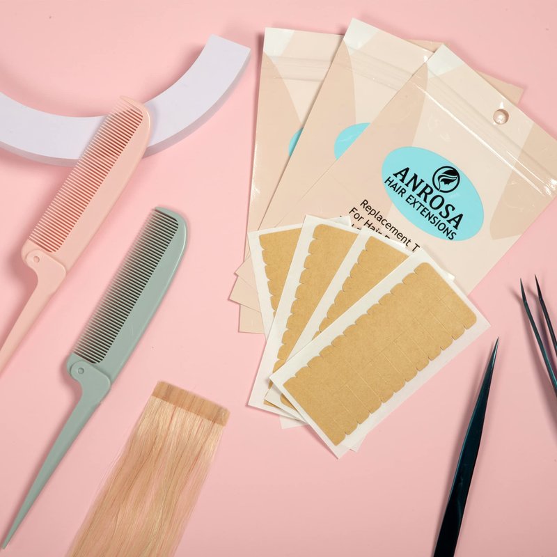 Anrosa Double Sided Tape for Hair Extensions Replacement Tape Adhesive Hair Extension Tapes, Hair Extension Tapes for Hair Extensions Wigs Supplies 72 Tabs (4cm x 0.8 cm) with Rat Tail Parting Combs