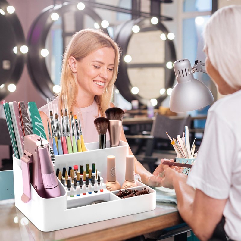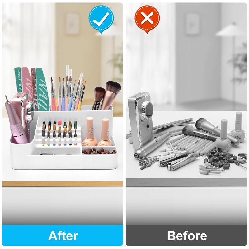 - Nail Drill Machine & Bits Storage Box - Made of sturdy & durable plastic material, It is easy to clean and not easy to break. No more messy manicure tools at work! This nail desk organizer is not only a simple nail drill bit holder, but also a good nail tech must have, it can be used to organizer the mainly nail must haves, such as nail drill machine, nail drill bits, nail files, nail art pens, nail polish and nail glue gels. (Not Included Nail Drill Machine & Bit)
