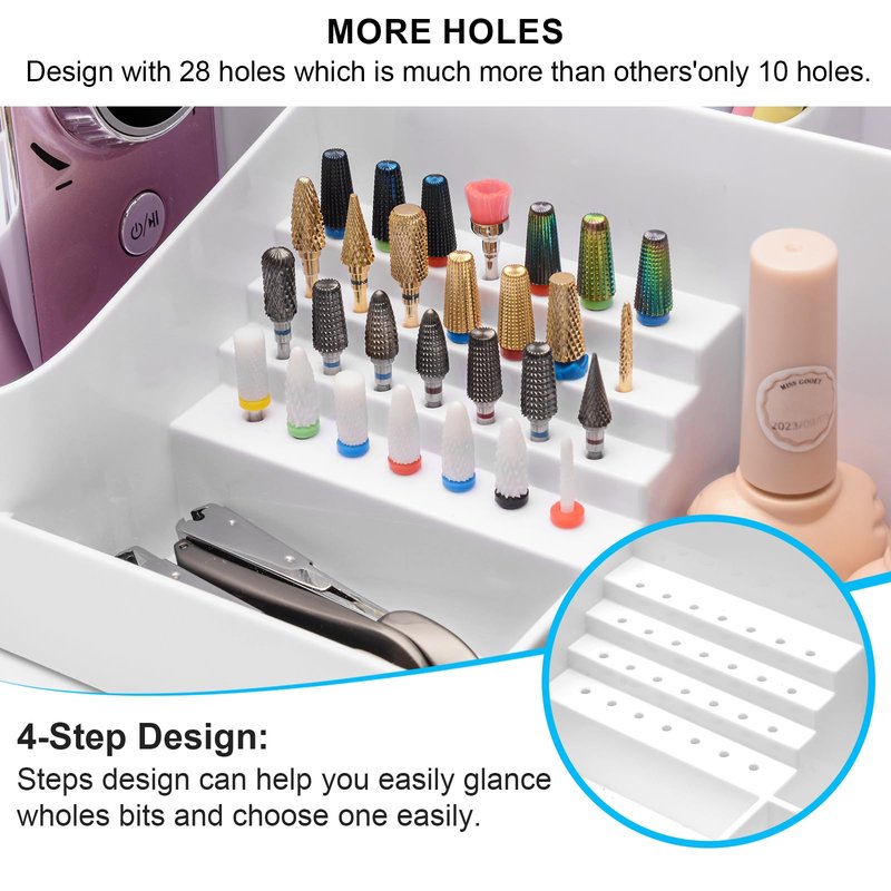 - Professional Nail Drill Holder - Designd with divided storage space, the lowest slots are used for short & small nail tools, such as nail sanding bands, nail cotton pads, or nail glue; the middle part is step-style which can store 28pcs 3/32 inch nail drill bits totally, the higher part is composed of 4 seperately deep slots which can hold up nail drill machine, long flat nail files, nail art pens as well as other nail must haves.