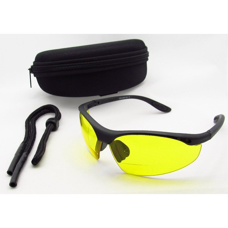 ANSI Z87.1 Motorcycle Yellow Bifocal Safety Glasses 2.50 for Men and Women. Half Framed Wraparound Style. Free Hard Case & Sunglass String