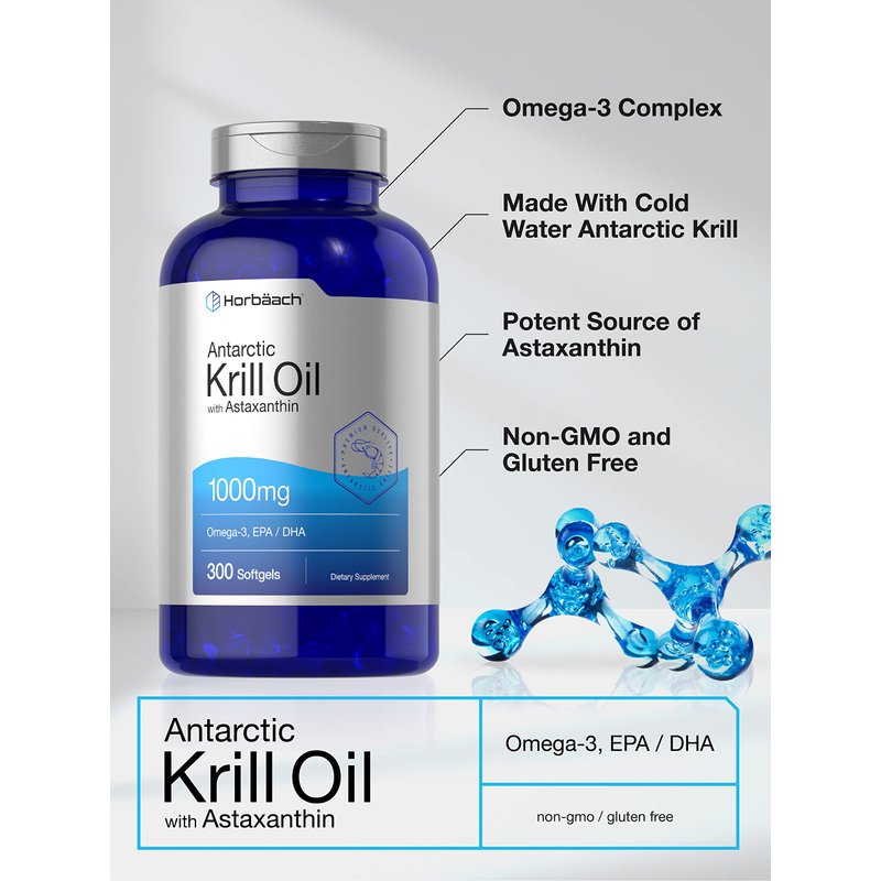 Antarctic Krill Oil 1000mg | 300 Softgel Capsules | Omega 3, EPA, DHA Supplement | with Astaxanthin | Value Size | Non-GMO, Gluten Free | by Horbaach