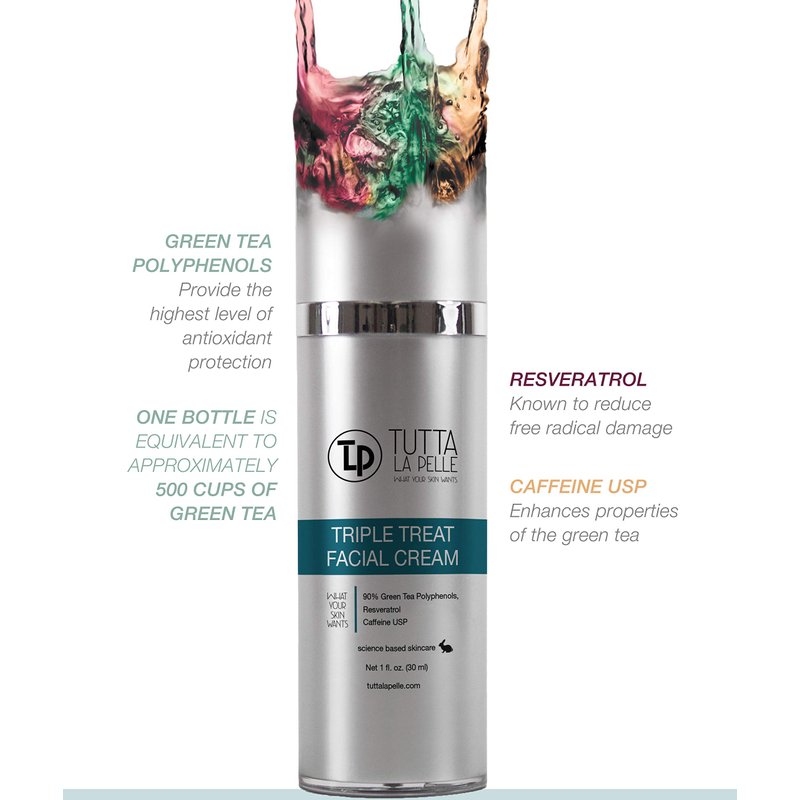 Therapeutic effects are specifically from the concentrated polyphenol fraction isolated from the camellia sinensis (green tea) leaf. TuttaLaPelle’s Triple Treat Facial Cream is a high-end, non-prescription formula that utilizes the whole polyphenol fraction purified to 90% - the highest concentration and purified form available, calming skin and restoring it back to its natural peaceful state.
