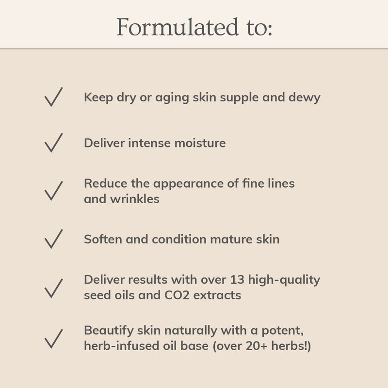 - ANTI AGING FACIAL OIL - Luxurious, herb-infused formula delivers intense moisture to keep dry and mature skin supple and dewy.