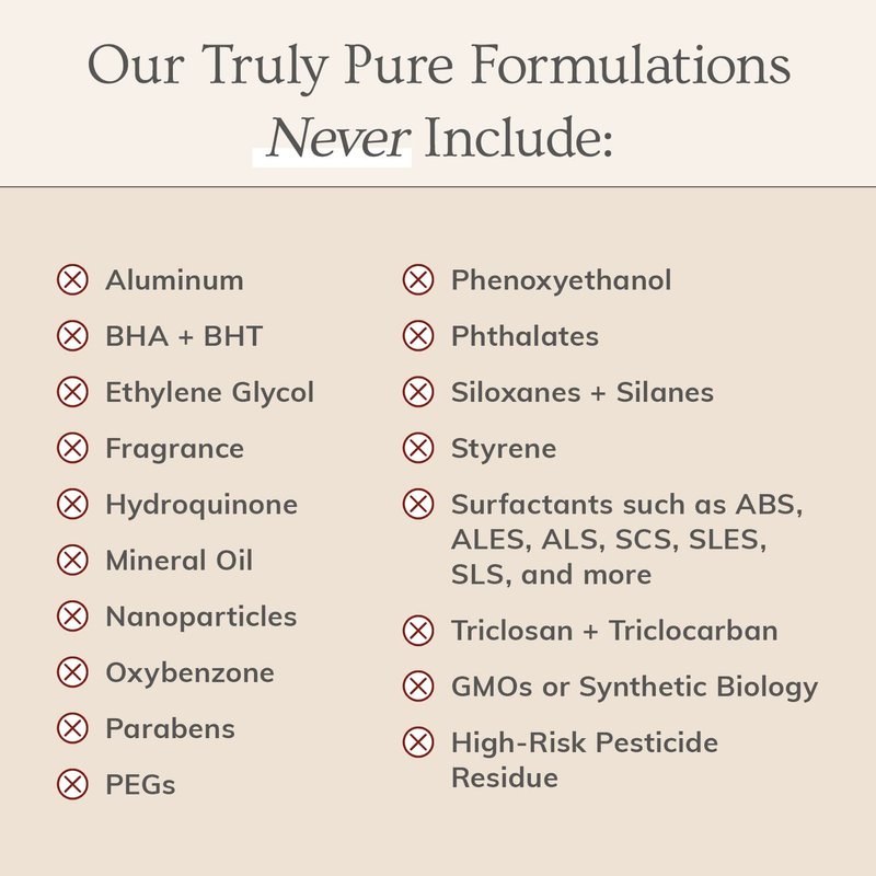 - OUR PROMISE: All our products are free of toxic chemicals, colors and fragrances. Everything in our products is on our labels; and are sustainably packaged, cruelty-free certified by Leaping Bunny, non-GMO, Made Safe Certified and made in the U.S.A.