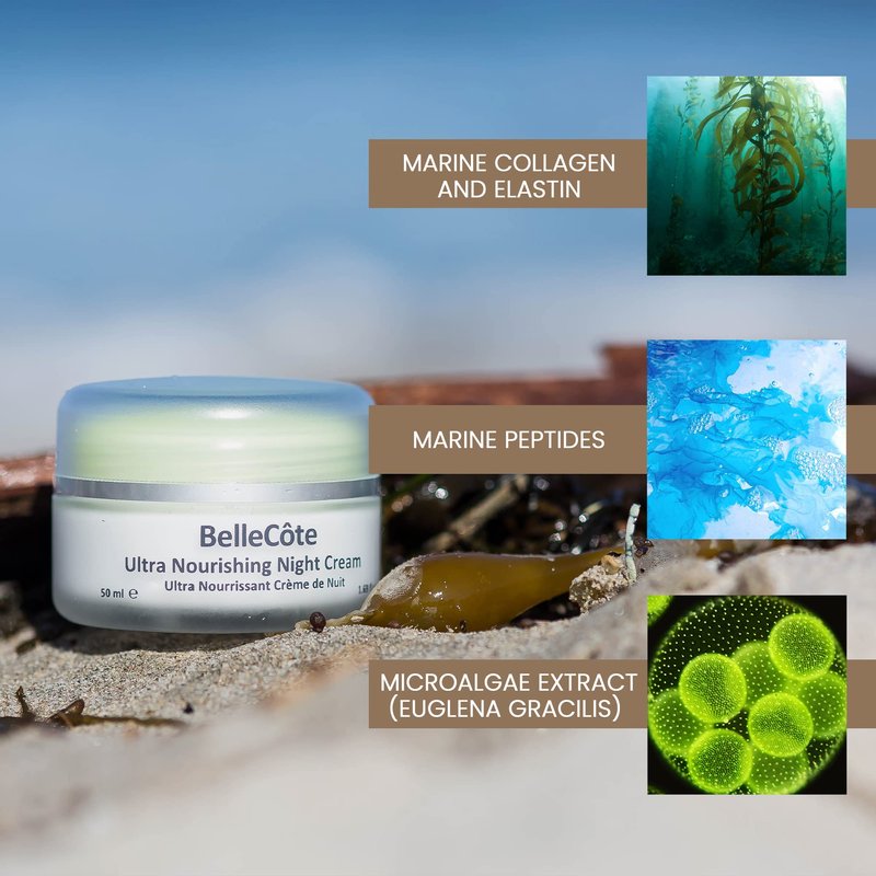 - Active Ingredients: The Ultra nourishing night cream contains marine collagen and elastin, marine peptides, microalgae extracts and retinol along with vitamin C & E. It is an anti-aging peptide moisturizer that makes skin healthy and glow-y.