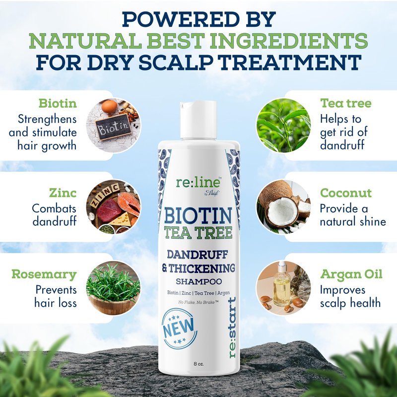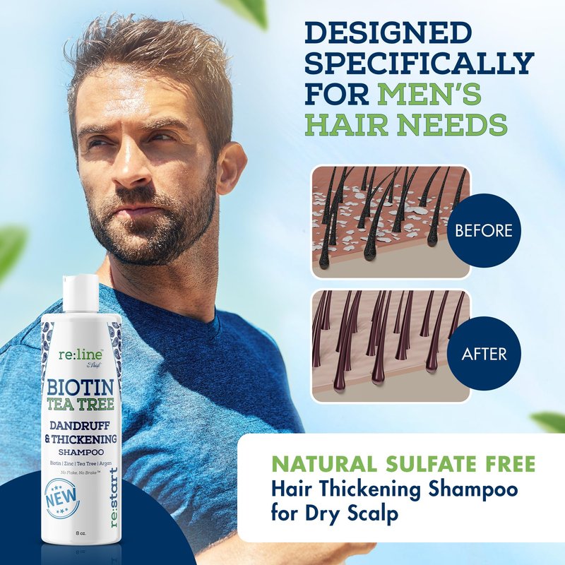 - TEA TREE OIL SHAMPOO FOR DANDRUFF re:line mens dandruff shampoo is the ultimate 2-in-1 sulfate free dandruff shampoo for men with a dry flaky scalp both known to cause hair loss shedding and thinning hair - Get thicker fuller hair and less hair loss with this all natural anti dandruff shampoo dandruff treatment for men