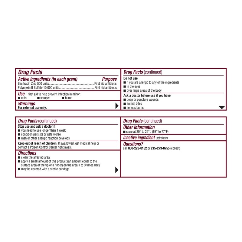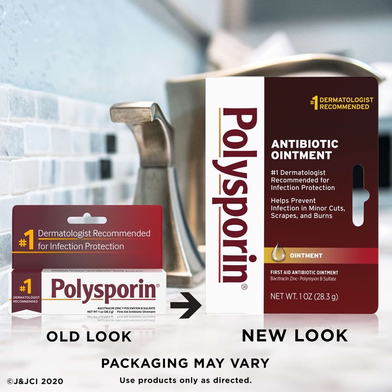 Prevent infection in minor cuts, scrapes, and burns with Polysporin First Aid Antibiotic Ointment. Combining the power of bacitracin with polymyxin B, this ointment provides you with first aid antibiotic power without neomycin. Polysporin First Aid Antibiotic Ointment is the dermatologist-recommended first aid ointment for treating infection. Simply apply a small amount of this product on the affected area one to three times a day and enjoy protection. The tube contains 1 ounce of ointment.