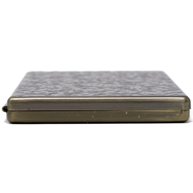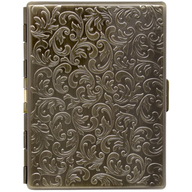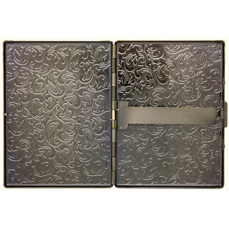 Gunmetal-plated metallic cigarette case that features an etched pattern on the front. Measuring 3.7" X 3.5", this case is compact and can accommodate 9 individual cigarettes including 100s (100mm), King (84mm) and Regular (70mm) Size cigarettes.