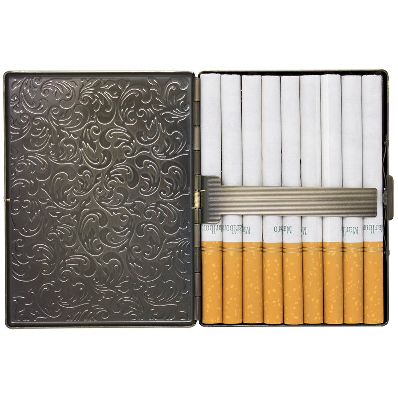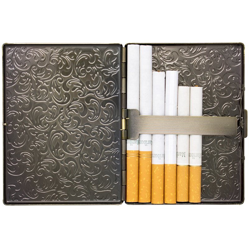 - Gunmetal-plated metallic cigarette case that features an etched pattern on the front. Measuring 3.7" X 3.5", this case is compact and can accommodate 9 individual cigarettes including 100s (100mm), King (84mm) and Regular (70mm) Size cigarettes.