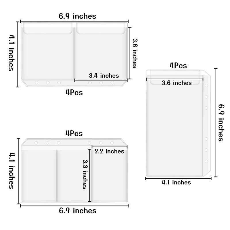 - Total 12 pieces, 3 different sizes, 4 pieces each size, 1-pocket bill pouches/cash envelopes, 2-pocket photo protectors, 3-pocket card pages, suitable for refillable A6 6-ring notebook/budget binder/budget planner/money binder/savings binder