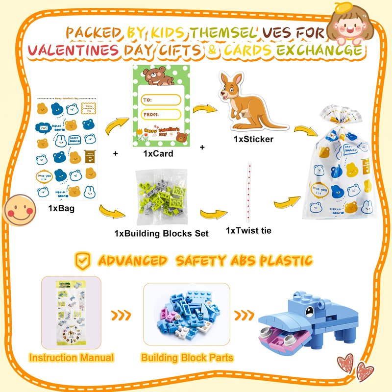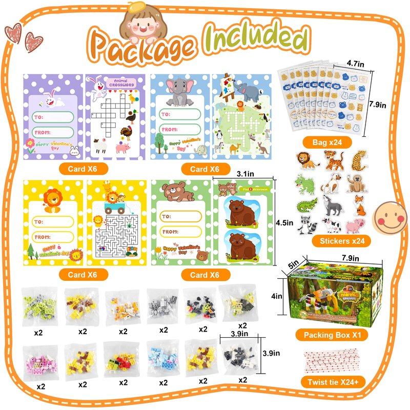 - Valentines Day gifts for kids:Our Valentines day gifts set have 24PCS animal building blocks, 24PCS kids valentines cards, 24PCS valentines day stickers, 24 cute OPP bags & twist tie * 24