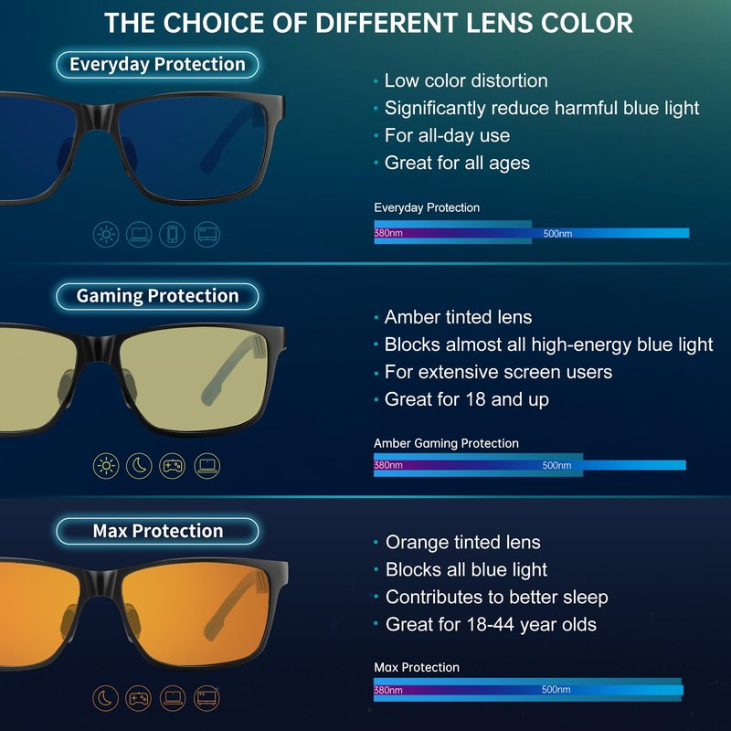 - Improved Performance and Productivity- Extended exposure to blue light rays may cause fatigue and stress. Filtering out the high energy blue light allows you to focus on your game or task at hand