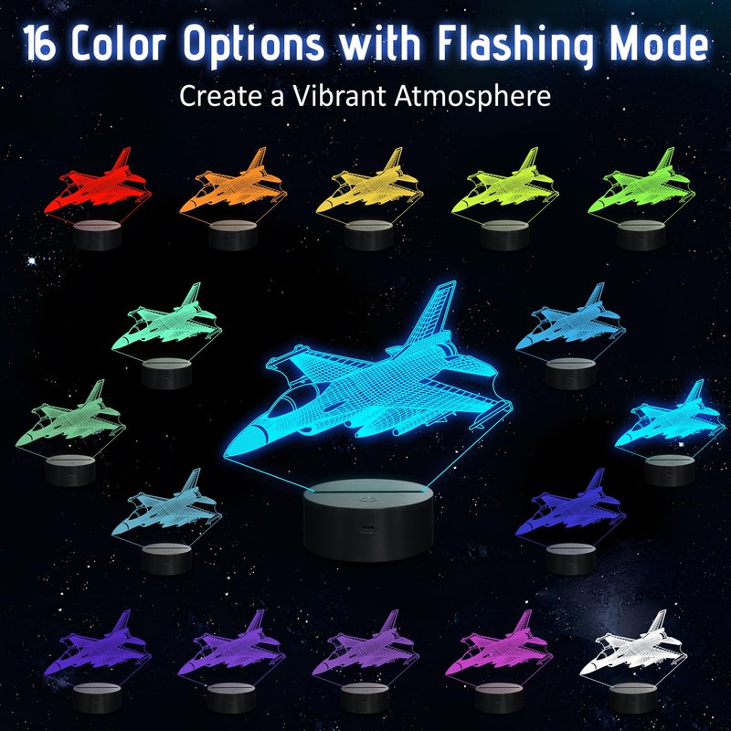 - 【Remote control + timer + dimming + smart touch】 The new upgraded version of the Warplane night light can be freely set from 15 minutes to 12 hours. The 3d light has 16 kinds of color changes and 4 kinds of flickering (flash, strobe, fade and smooth) can also adjust the speed, you can adjust the brightness of the light without affecting sleep