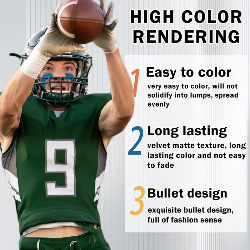 Sports eye black stick can be used for baseball,football,softball and other games.Applying under the eyes to reduce the glare of the sun or lights,allowing athletes to better focus on the game. 1.Long-lasting&waterproof,face painting stick is made of high-quality formula,with strong coloring power,not easy to fade,and has good waterproof effect,long-lasting makeup,allowing you to maintain a high-color exquisite makeup for a long time. 2.Premium formula,eye black stick are made of high-quality pigments,with rich colors and high color rendering,bringing strong color effects to your makeup.The ingredients are gentle and safe,friendly to your skin. 3.Wide range of uses,eye black stick is delicate and compact,easy to carry,suitable for parties,cosplay,Halloween SFX makeup, themed costume performances,sports competitions and other occasions.