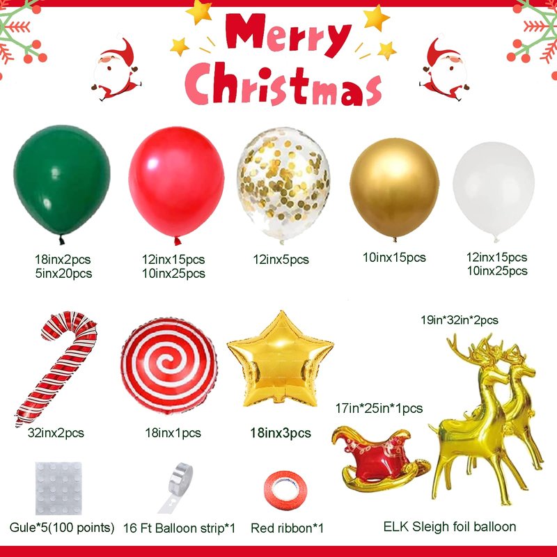 - 【Package include】Christmas Balloons KIT:138pcs Christmas balloon arch kit,Package includes:6x18inch balloons(green*2+gold star*3+Candy*1)35x12inch balloons(red*15+white*15+gold confetti*5),65x10inch balloons(red*25+white*25+gold*15)20x5inch green balloons,2pcs Christmas reindeer balloons, 2pcs 32inch Candy Cane balloon,1pcs of sleigh balloon,Whole Balloon Garland Accessories Kit (16 ft balloon strip*1+100pcs glue*1+ribbon*1)