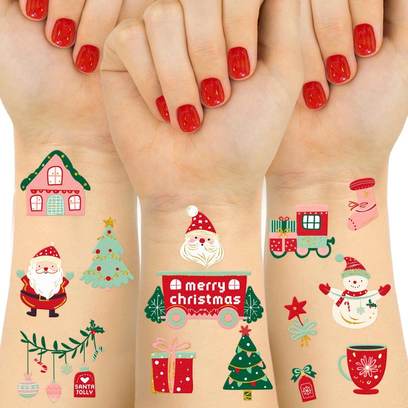 - Cute Temporary Tattoos stickers: This fake stickers are beautifully printed and contain lots of fun design for kids and girls to pick out. Such as christmas tree, house, stocking, train, present and other xmas-related motifs