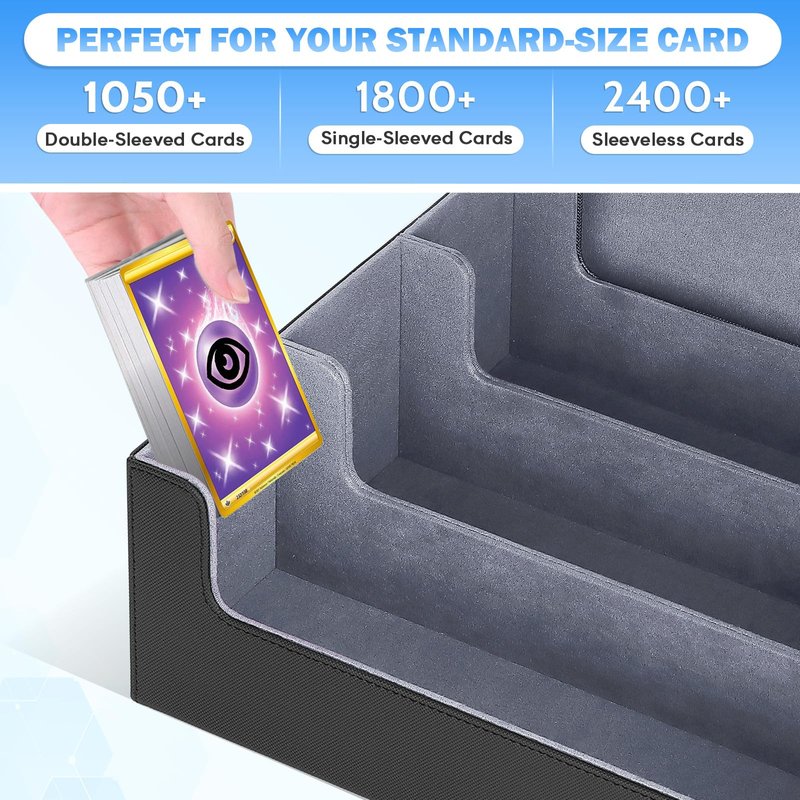 - 【Holds 1800+ Cards】The size of our card deck case for trading cards is 29x24.5x10.5cm/11.42 x 9.65 x 4.13 inches, it's large enough to store 1800+ standard size trading game cards,also suitable for holding 1050+ double-sleeved cards or 2400+ sleeveless cards,Does NOT fit top loaders sleeves.
