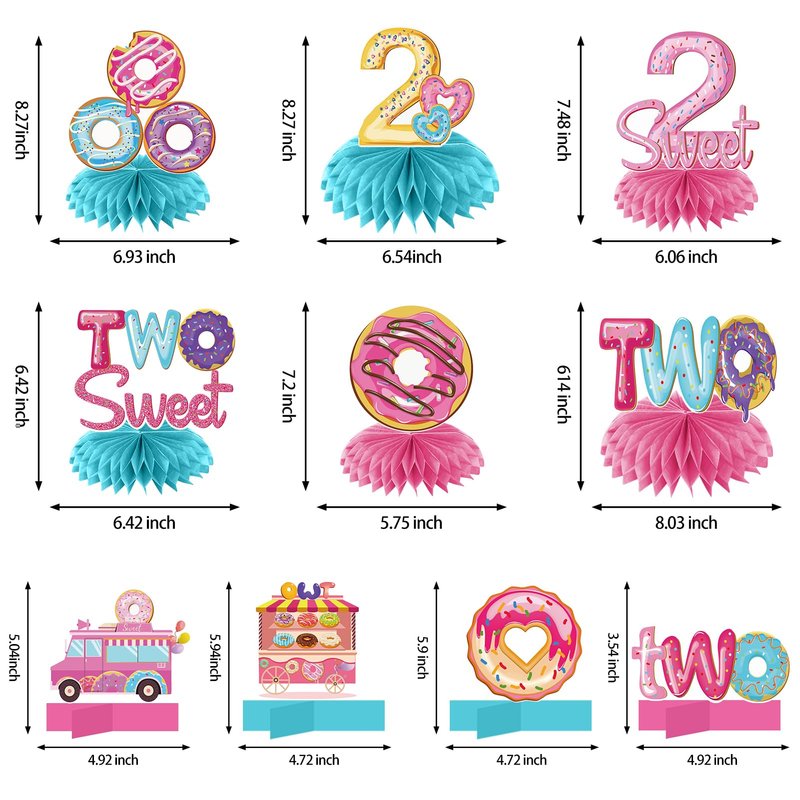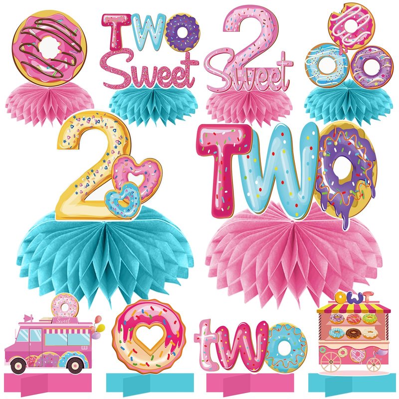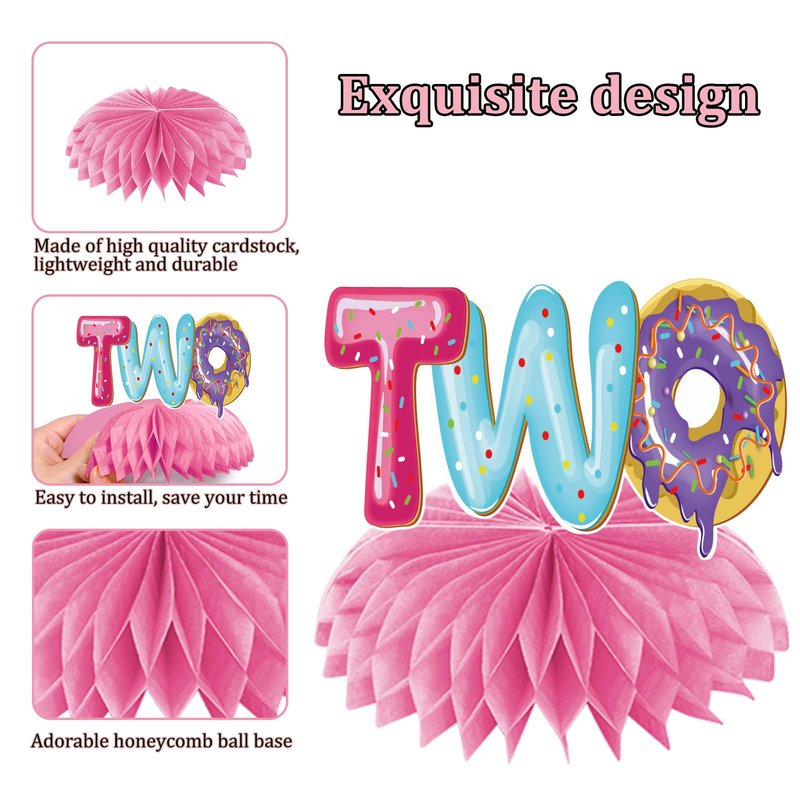 - [You will get]- 10 Two Sweet Donut Party Centerpieces, including 6pcs paper honeycomb balls, 4pcs pink cardboard holders, and 10 donut-themed patterns, to create a strong birthday atmosphere for your party.Believe it will be the perfect choice for your Donut 2nd Birthday Party decorations.