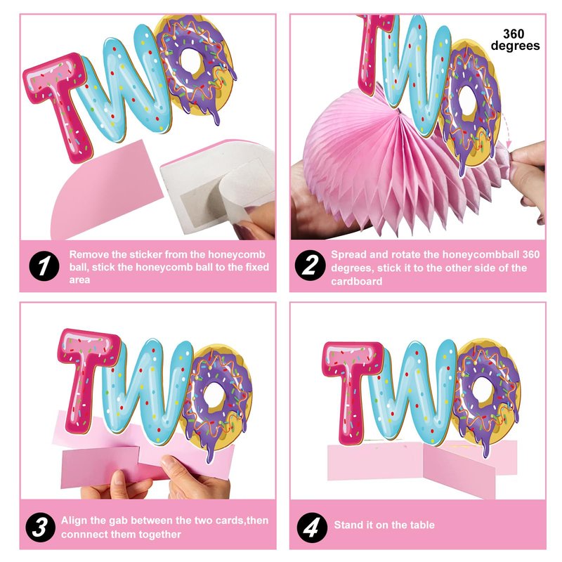 - [Easy to install] - Remove the sticker from the honeycomb ball, stick the honeycomb ball to the fixed part, and then unfold and rotate the honeycomb ball 360° to stick it to the other side of the cardboard. Unfold the honeycomb ball to obtain honeycomb centerpieces. In addition, cross insert two rectangular cardboard sheets from the middle to connect them, and then insert donut cards decoration to form a cardboard cross stand. Place them horizontally where you want to decorate them.
