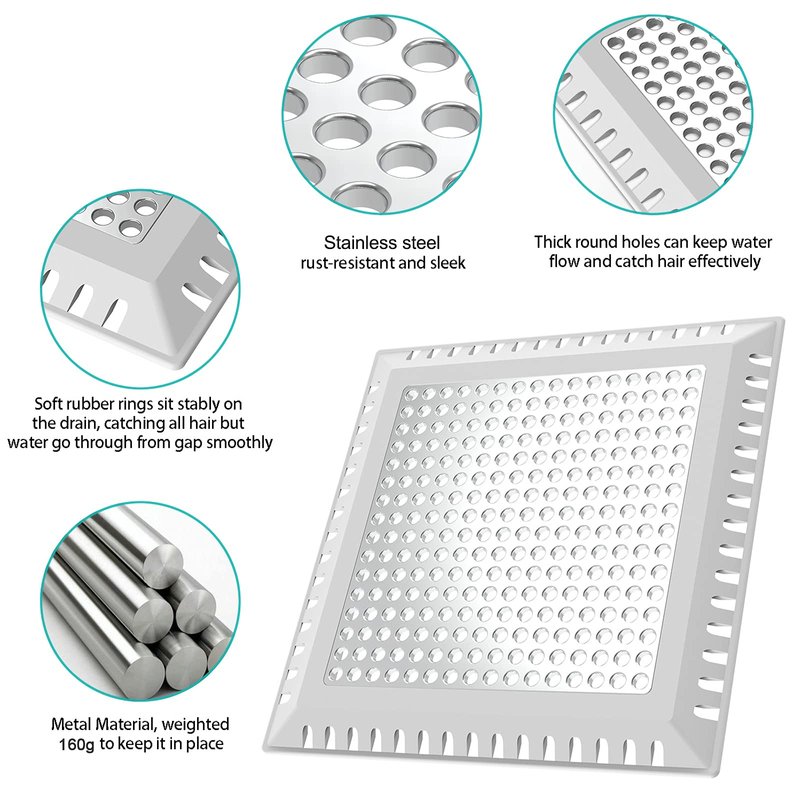 Shower Drain Hair Catcher /Drain Protector/ Drain Strainer for bathroom floor drain Can be used in the shower drain Easy and quick installation Made with durable stainless steel Durable and sturdy construction Specification: Material: zinc alloy Size: 6.85'' * 6.85'' Package Include: 1*drain cover 1*rubber ring