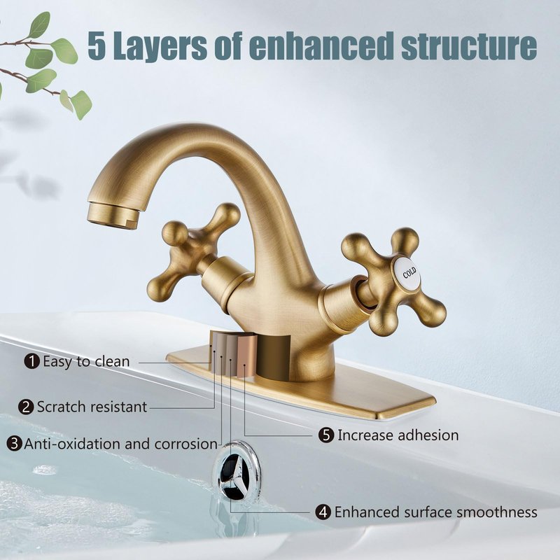 - 【All Metal Construction】Water Use Information: 1.19gpm 4.5L/min Deck mounted 1 hole basin cross handle bathroom faucet constructed from solid brass, antique brass finish,prevent to be discolored and rusty.Suitable for lifelong use