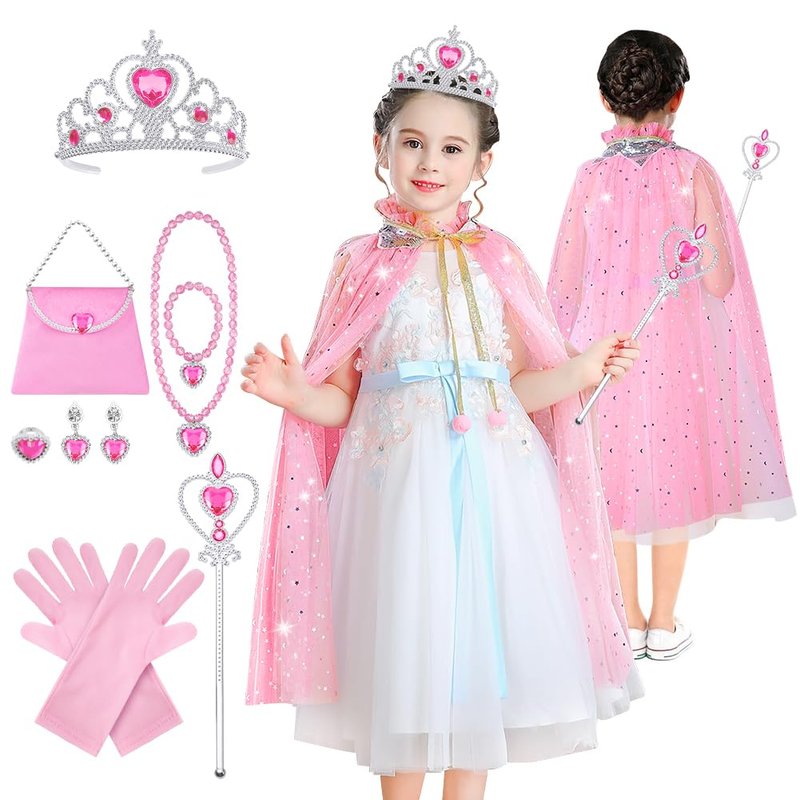 AOMIG 11PCS Princess Cape Set, Princess Cape Clothes With Crown, Wand, jewelry, and bag, Princess Dress Up Clothes for Little Girls, Princess Cape for 3-8Year Old Halloween Christmas Birthday Gifts
