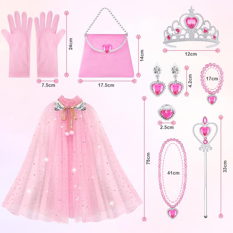 - 🌟Princess Cape Set: Every little girl’s dream is to become a shining little princess, order a special gift for your baby girl. Princess Cape Set a total of 11 pieces. These include sparkling capes, small toy purses, ear clips, princess rings and necklaces, bracelets, gloves, princess wands, and princess crowns, adding extra glamor to the entire girl's princess look with the princess dress-up cape set.