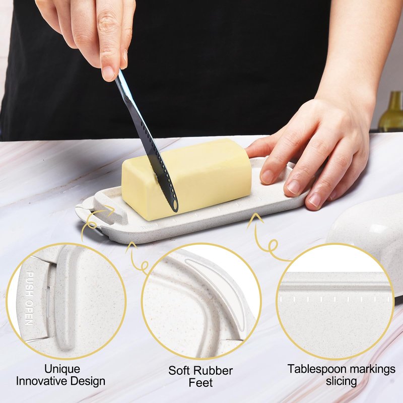 - 【Safe Material & Lightweight】AONCO butter holder is made of food-grade material, BPA free. it is lightweight and easy to carry with one hand, and will not be broken by kids or cats; Under the bottom there are four rubber feet to prevent it from moving when taking butter(No included Knife)